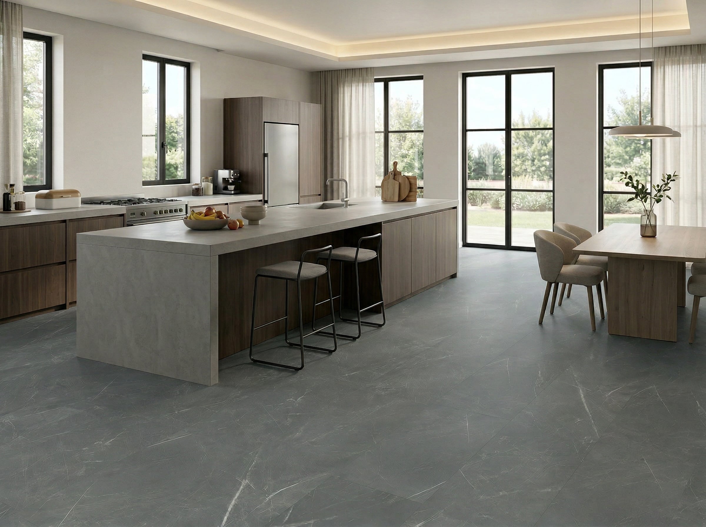 Platinum Grey provides a natural stone marble appearance through it’s dark tones and light lines. A beautiful option for those who desire a dark elegant atmosphere within their kitchen and bathroom areas, or even throughout the entire house.